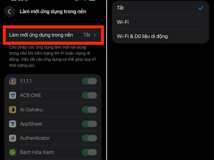 Vào Cài đặt > Cài đặt chung > Làm mới ứng dụng trong nền để điều chỉnh bật/tắt hoặc chọn sử dụng Wi-Fi/Data di động.