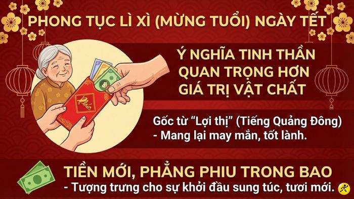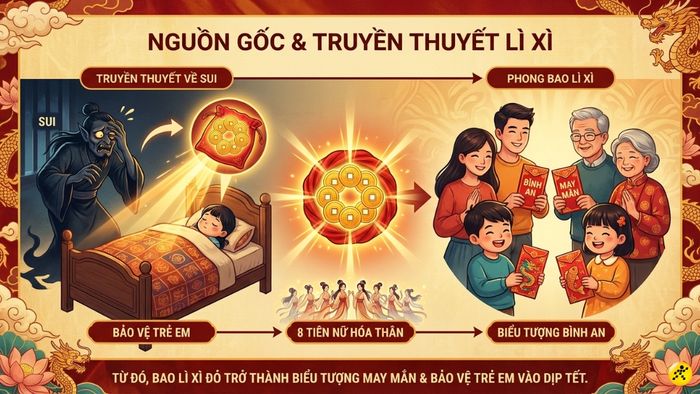 Phong tục lì xì bắt nguồn từ Trung Quốc, gắn liền với truyền thuyết về việc bảo vệ trẻ em khỏi tà ma trong đêm Giao thừa.