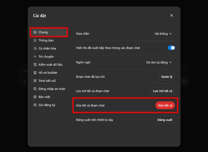 Bước 2: Trong phần Cài đặt, điều hướng đến mục Chung rồi chọn tính năng Xóa tất cả đoạn chat - công cụ giúp bạn dọn sạch mọi lịch sử trò chuyện đã lưu trữ.