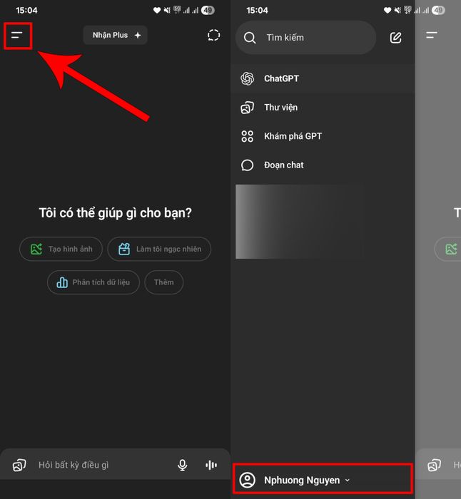 Bước 1: Từ giao diện chính, nhấn vào biểu tượng menu ba gạch ngang góc trái màn hình để mở thanh điều hướng > Chọn mục thông tin tài khoản cá nhân của bạn.