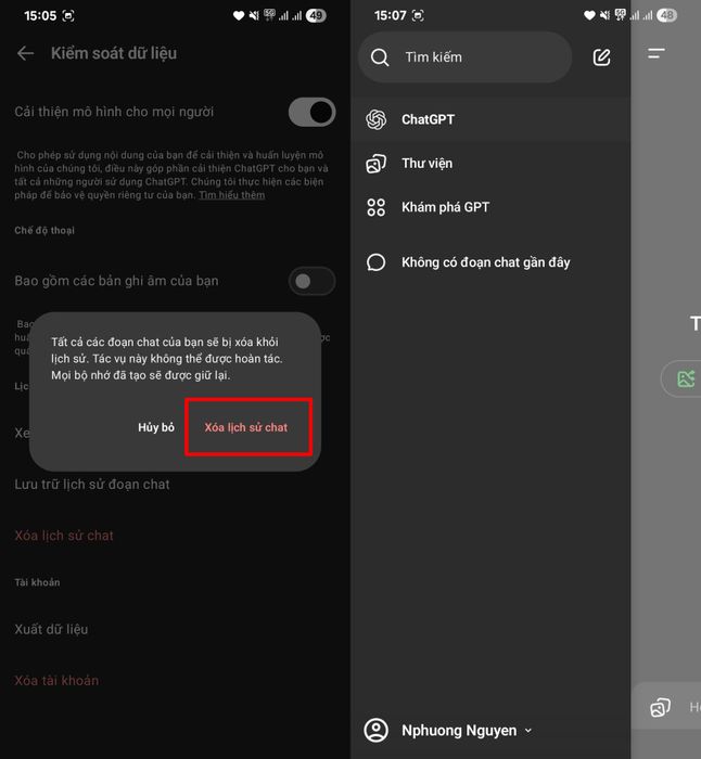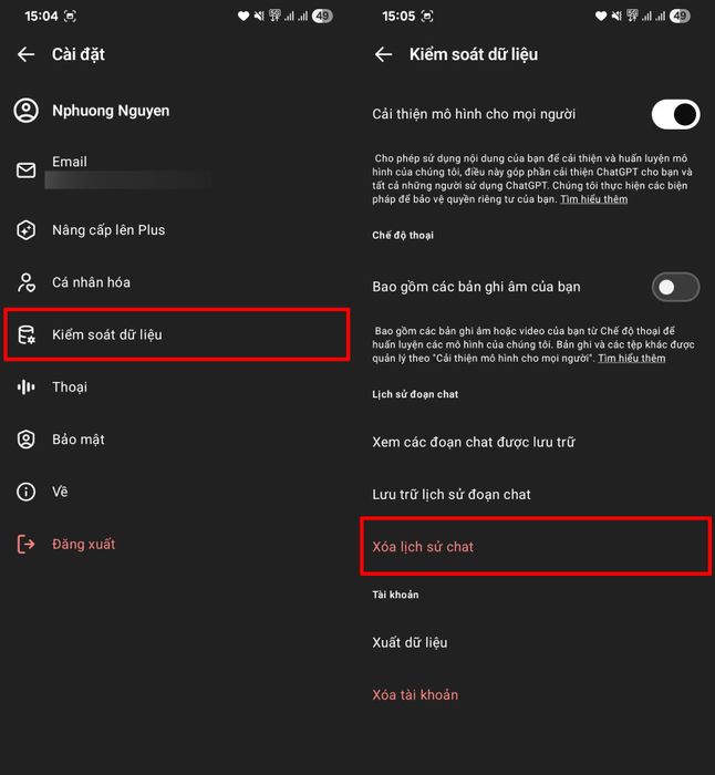 Bước 2: Trong phần cài đặt tài khoản, tìm và chọn mục Quản lý dữ liệu > Nhấn vào tùy chọn Xóa lịch sử chat để tiến hành xóa sạch mọi cuộc trò chuyện đã lưu trữ.
