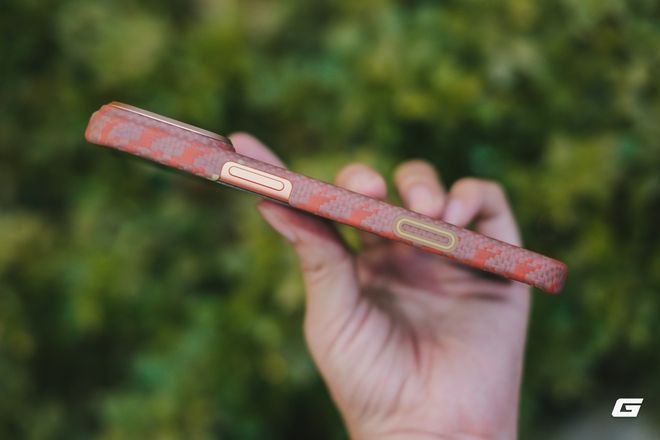 Vật liệu aramid dệt chính là yếu tố tạo nên sự khác biệt. Bề mặt không bóng như nhựa cứng, cũng không bám tay như silicone, mà giống như một lớp vải mịn, có độ nhám nhẹ, đủ để cầm chắc mà không bị dính. Dùng lâu không bị lưu lại dấu vân tay và gần như không lo ố vàng theo thời gian. Đây là sự nâng cấp đáng giá với những ai từng phải thay ốp silicon vì xuống màu.
