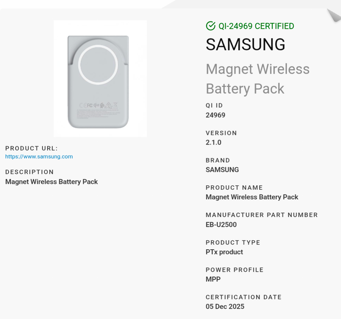 Đây là mẫu pin sạc dự phòng đầu tiên của Samsung có khả năng gắn từ tính trực tiếp lên điện thoại, cho thấy hãng đang tiến gần hơn bao giờ hết đến việc áp dụng chuẩn sạc không dây từ tính. Phiên bản mang mã EB-U2500 được mô tả với tông xám nhạt, thiết kế tối giản và vòng nam châm tròn tương thích chuẩn Qi2.