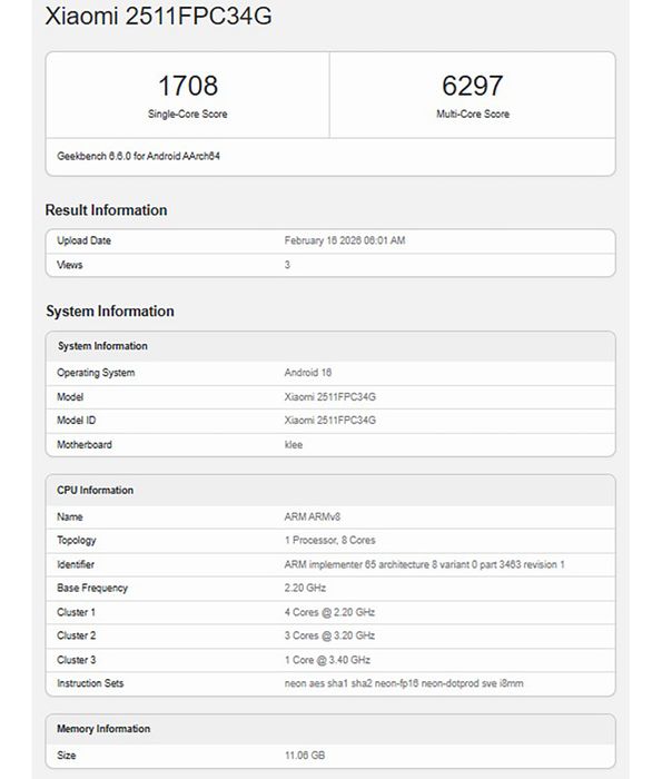 Cụ thể, POCO X8 Pro xuất hiện trên Geekbench với mã số 2511FPC34G. Tại đây, điện thoại này được xác nhận sử dụng chip Dimensity 8500 của MediaTek, kết hợp với 12GB RAM và hệ điều hành Android 16.