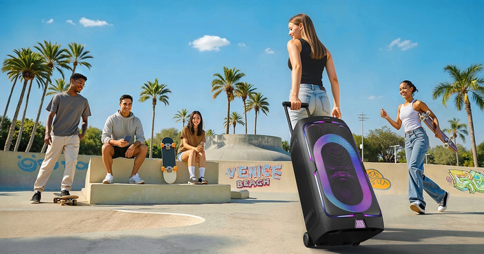 Samsung đã nâng tầm thiết kế để khẳng định dòng loa này hướng đến tính di động tối đa. Với ST50F, người dùng có thể dễ dàng kéo loa như một chiếc vali nhờ tay cầm và bánh xe tích hợp, điều mà nhiều đối thủ vẫn chưa có. Thiết kế này không chỉ giúp giải quyết vấn đề trọng lượng mà còn thể hiện triết lý "Grip & Roll" mà Samsung theo đuổi: tiệc có thể bắt đầu ở bất cứ đâu, không bị giới hạn bởi không gian.