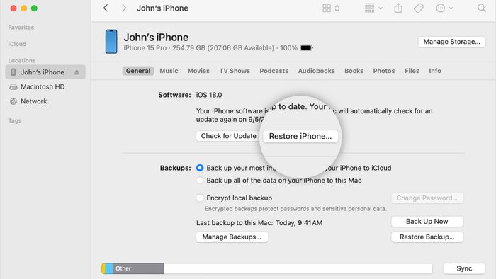 Chọn "Restore iPhone" (Khôi phục). Máy tính sẽ tự động tải phần mềm iOS mới nhất và cài đặt lại cho iPhone.