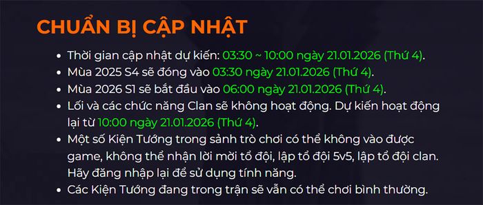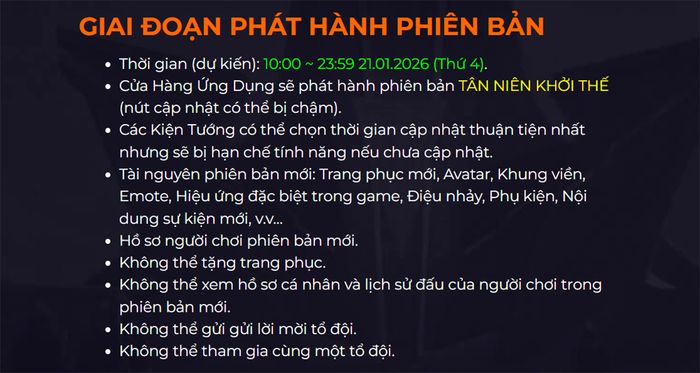 Phiên bản mới Tân Niên Khởi Thế sẽ được cập nhật từ 03h30 đến 10h00 ngày 21/01/2026. Trong khoảng thời gian này, người chơi có thể gặp tình trạng gián đoạn tạm thời khi truy cập game, vì hệ thống sẽ tiến hành nâng cấp.