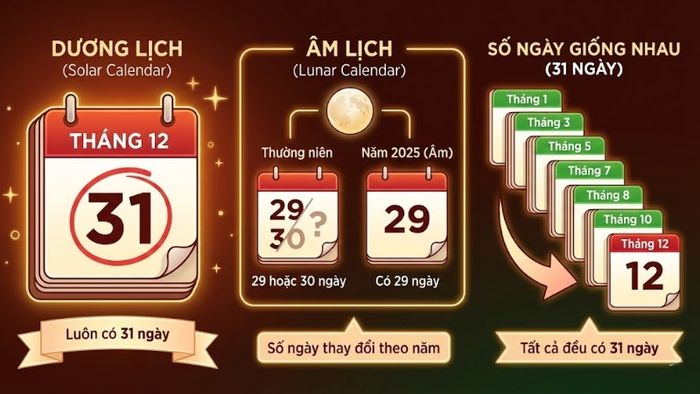 Theo Dương lịch, tháng 12 có 31 ngày; còn theo Âm lịch, số ngày có thể thay đổi theo từng năm, phổ biến nhất là 29 hoặc 30 ngày.