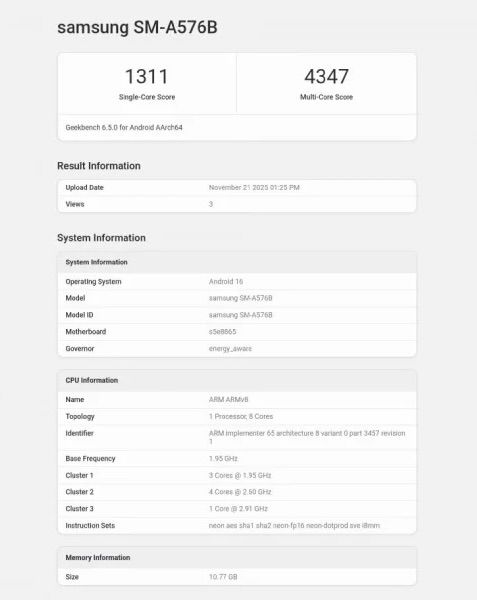 Galaxy A57 sở hữu màn hình AMOLED 6.6 inch với độ phân giải Full HD+, đảm bảo hiển thị sắc nét và màu sắc sống động. Máy được trang bị vi xử lý 8 nhân với xung nhịp tối đa 2.9 GHz, có thể là Exynos 1680, theo thông tin từ Geekbench.