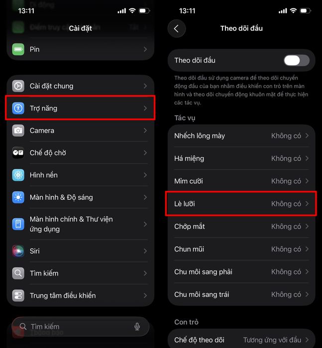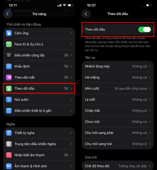 Bước 3: Khi muốn kích hoạt tính năng này, bạn chỉ cần quay lại mục Trợ năng > Bật chế độ Theo dõi đầu. Ngay lập tức, các thao tác đã được thiết lập sẽ bắt đầu hoạt động, giúp bạn điều khiển iPhone một cách thú vị chỉ với cử chỉ khuôn mặt.