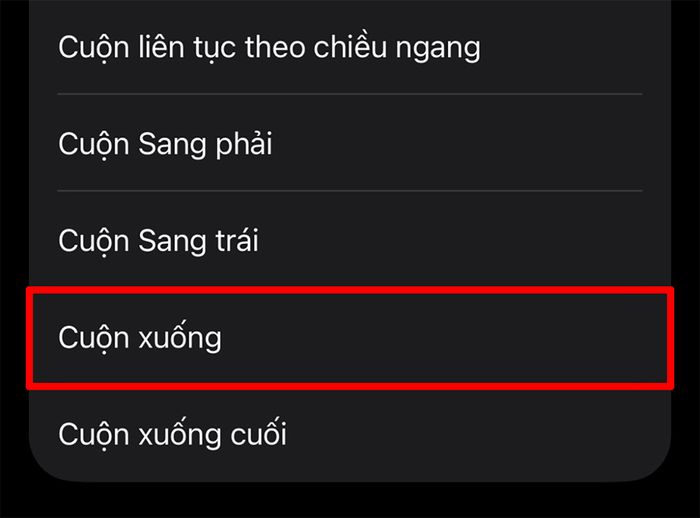 Bước 2: Sau khi đã chọn xong cử chỉ, tiếp tục chọn thao tác bạn muốn gán cho cử chỉ đó, như cuộn lên, cuộn xuống, quay lại màn hình trước, v.v. Nếu bạn muốn lướt TikTok hay Facebook, hãy chọn thao tác cuộn xuống để dễ dàng theo dõi nội dung.