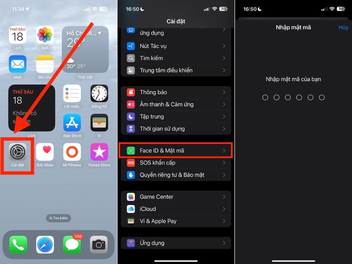 Bước 1: Truy cập ứng dụng Cài đặt > chọn mục Face ID & Mật khẩu (hoặc Touch ID & Mật khẩu tùy theo model iPhone) > Nhập mật khẩu hiện tại để xác thực quyền truy cập.