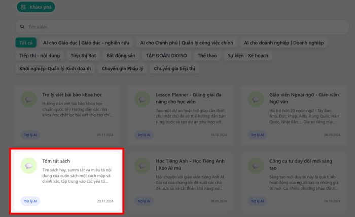 Bước 4: Trong danh sách các tính năng hiển thị, nhấn vào Tóm tắt sách – công cụ chuyên dùng để phân tích và rút gọn nội dung sách nhanh chóng.