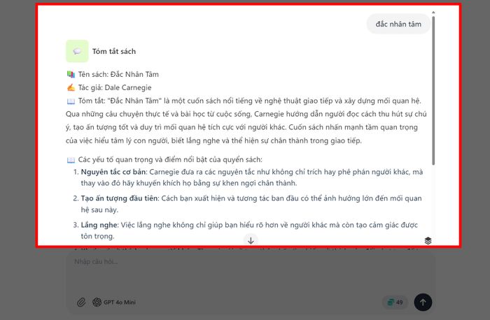 Bước 6: Đợi vài giây để ChatbotX AI phân tích và trả về bản tóm tắt súc tích, đầy đủ các ý chính, thông điệp và nội dung quan trọng từ cuốn sách bạn chọn.