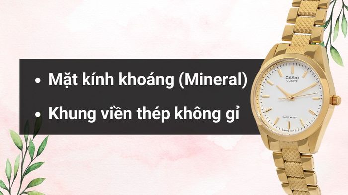 Kính khoáng, kính sapphire, hoặc kính cứng chống trầy xước, độ bền cao. |