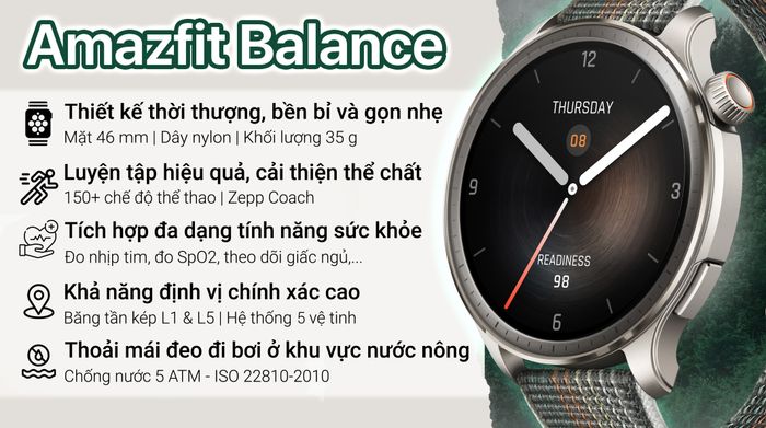 Amazfit Balance nổi bật với thiết kế thời trang, mặt tròn 46mm, màn hình AMOLED 1.5 inch sắc nét, siêu nhẹ chỉ 35g. Mẫu đồng hồ này tích hợp cảm biến BioTracker 5.0 và BIA, đo được 8 chỉ số thành phần cơ thể, nhịp tim, SpO2, mức độ căng thẳng, giấc ngủ và điểm sẵn sàng phục hồi.