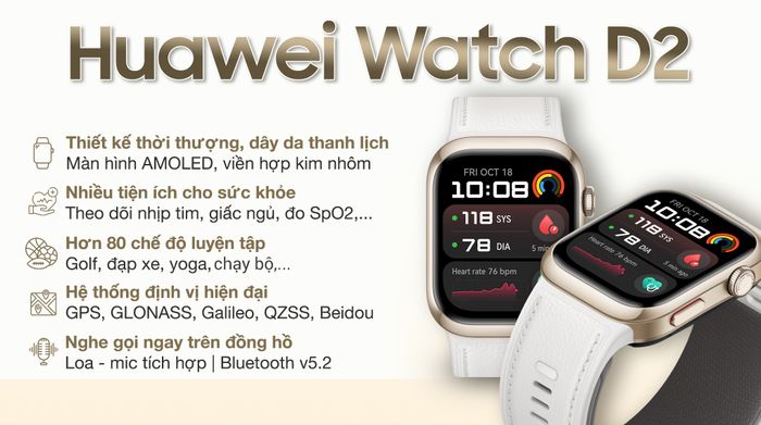 Huawei Watch D2 là chiếc đồng hồ thông minh cao cấp với khả năng đo huyết áp động 24/7 nhờ vào túi khí siêu mỏng được tích hợp trên dây đeo, cùng tính năng đo điện tâm đồ (ECG) giúp bạn quản lý sức khỏe tim mạch một cách chủ động. Sản phẩm sở hữu màn hình AMOLED 1.82 inch sắc nét, thiết kế mỏng nhẹ, khung hợp kim nhôm bền bỉ và dây đeo thoáng khí, thân thiện với da tay.