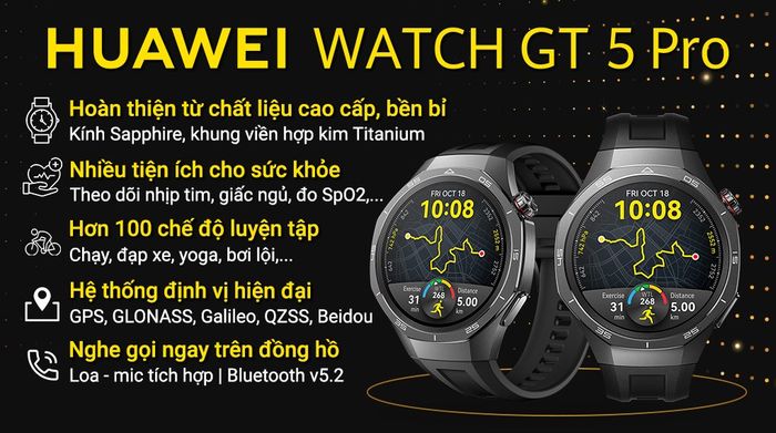Huawei Watch GT 5 Pro là một chiếc đồng hồ thông minh cao cấp với thiết kế sang trọng, khung viền Titanium, kính Sapphire chống xước và màn hình AMOLED 1.43 inch cực kỳ sắc nét. Đồng hồ nổi bật với các tính năng theo dõi sức khỏe toàn diện như đo ECG, SpO2, giám sát giấc ngủ và hơn 100 chế độ luyện tập.