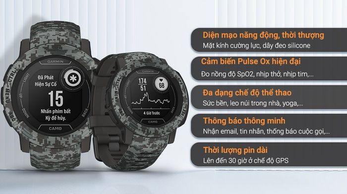 Garmin Instinct 2 mang đến thiết kế thể thao mạnh mẽ với vỏ polymer gia cố sợi, mặt kính cường lực và màn hình MIP 0.9 inch cho khả năng hiển thị rõ nét ngay cả dưới ánh nắng. Đồng hồ trang bị hệ thống định vị GPS, GLONASS, Galileo, cảm biến nhịp tim, SpO2, đo VO2 Max, theo dõi mức độ căng thẳng, giấc ngủ và chu kỳ kinh nguyệt.