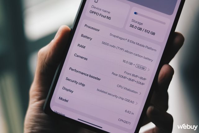 Mặc dù sở hữu cấu hình mạnh mẽ và viên pin dung lượng lớn, nhưng trọng lượng của Find N5 chỉ dừng lại ở mức 229g, gần như tương đương với một chiếc điện thoại cao cấp dạng thanh. Đây là minh chứng cho thấy OPPO đã tối ưu hóa phần cứng rất tốt để chiếc điện thoại này không chỉ mạnh mẽ mà còn tiện dụng trong thực tế.
