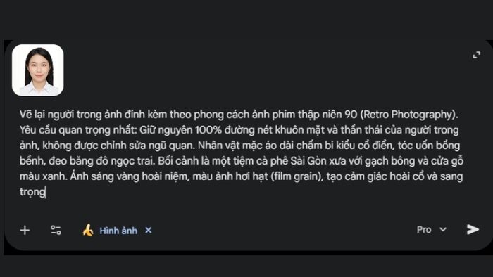 Tái hiện nhân vật trong ảnh đính kèm theo phong cách ảnh phim thập niên 90 (Retro Photography). Yêu cầu then chốt: Giữ nguyên tuyệt đối 100% đường nét khuôn mặt và thần thái của nhân vật, không chỉnh sửa ngũ quan. Nhân vật diện áo dài chấm bi cổ điển, tóc uốn bồng bềnh, cài băng đô ngọc trai. Bối cảnh là quán cà phê Sài Gòn xưa với nền gạch bông và cửa gỗ xanh. Ánh sáng vàng mang sắc thái hoài niệm, màu ảnh có độ hạt nhẹ (film grain), tạo cảm giác cổ điển và sang trọng.