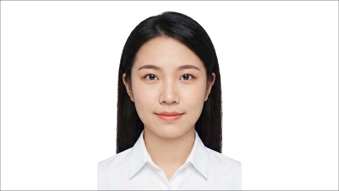 Ảnh toàn thân chụp ngoại cảnh với góc máy ngang tầm mắt. Chỉ sử dụng khuôn mặt từ ảnh gốc làm tham chiếu duy nhất, không sáng tạo hay thay đổi khuôn mặt. Cô gái mặc áo dài lụa trắng tinh khiết, tà áo bay nhẹ tự nhiên, đứng e ấp bên cây mai vàng cổ thụ đang nở rộ. Ánh nắng xuân rực rỡ tạo hiệu ứng ngược sáng (Backlight) lấp lánh trên mái tóc. Không gian sân vườn ngày Tết truyền thống Việt Nam, tông màu trong trẻo và tươi sáng.