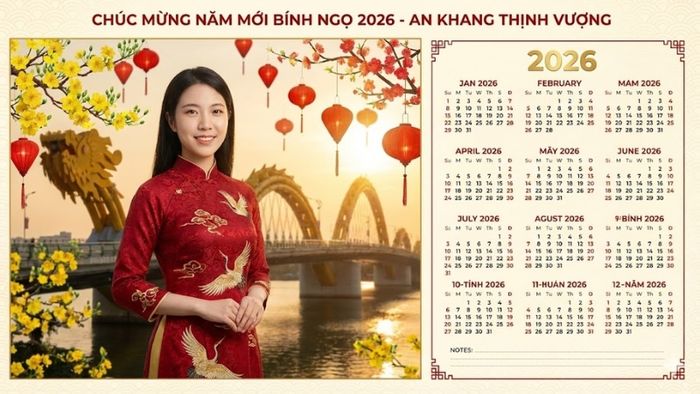 Thiết kế poster lịch treo tường trọn bộ 12 tháng cho năm 2026 theo phong cách Tết Sang Trọng. Nhân vật trung tâm là người xuất hiện trong ảnh đính kèm. Yêu cầu bắt buộc: Chỉ sử dụng ảnh đính kèm làm nguồn tham chiếu duy nhất cho khuôn mặt. Làm mịn da nhẹ nhàng nhưng tuyệt đối không can thiệp vào cấu trúc xương mặt, giữ nguyên 100% hình dáng mắt, mũi và miệng so với ảnh gốc. Tạo dáng: Nhân vật khoác tà áo dài gấm đỏ thêu chỉ vàng họa tiết chim hạc, toát lên vẻ duyên dáng và thanh lịch. Phông nền là khung cảnh Cầu Rồng Đà Nẵng (hoặc Hồ Gươm/Chợ Bến Thành) được xử lý nghệ thuật với không khí Tết rộn ràng: mai vàng, đào hồng và lồng đèn đỏ tung bay trong gió. Ánh sáng nắng vàng ấm áp tạo chiều sâu mang phong vị điện ảnh. Bố cục ảnh dọc hài hòa, chừa khoảng trống tinh tế để hiển thị bộ số lịch năm 2026. Tổng thể mang lại cảm giác hân hoan, sung túc, mở đầu năm mới Bính Ngọ an khang thịnh vượng.