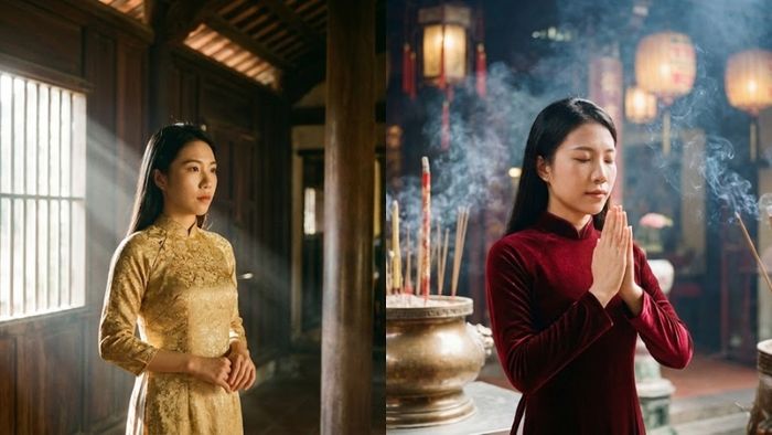 Bức ảnh ghi lại khoảnh khắc linh thiêng và trang nghiêm. Cô gái (giữ nguyên khuôn mặt ảnh gốc 100%) chắp tay thành tâm cầu nguyện trong một ngôi chùa cổ kính. Áo dài đỏ nhung kín đáo. Không gian bao quanh là làn khói hương trầm bảng lảng và ánh sáng vàng ấm từ hàng trăm chiếc đèn lồng. Ảnh có độ tương phản hài hòa, tập trung thể hiện cảm xúc an yên và niềm hy vọng đầu năm mới.
