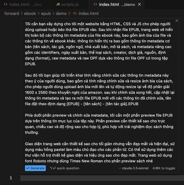 Sau vài giờ chỉnh sửa từng phần bằng các câu lệnh đơn giản như "resize ảnh bìa về 1600 x 2560", "thêm tính năng thay đổi ảnh bìa", "hiển thị metadata dạng bảng dễ đọc hơn", tôi đã sử dụng khoảng 273 request nhanh từ gói Pro. Điều đặc biệt là tôi không phải viết bất kỳ dòng code nào. Cursor AI đã xử lý tất cả từ việc đọc cấu trúc EPUB, trích xuất thông tin từ file OPF, đến xử lý ảnh và tạo ra file EPUB mới.