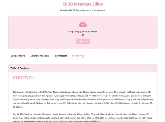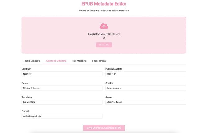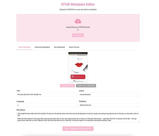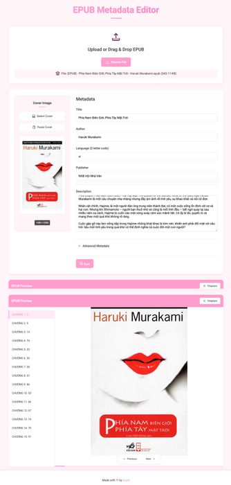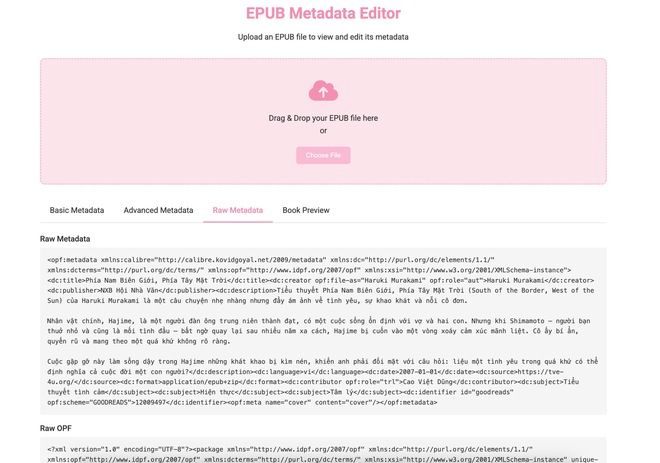 Đây là bản gần như hoàn thiện của trang web chỉnh sửa metadata file EPUB. Có thể tôi sẽ tiếp tục tối ưu hóa hoặc thêm các tính năng mới, chẳng hạn như tự động tìm kiếm thông tin metadata trên Goodreads, hoặc thậm chí tích hợp tính năng sách nói với công cụ Text-to-Speech của OpenAI, nghe có vẻ thú vị phải không?