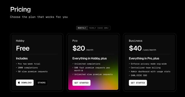 Cursor AI cung cấp 3 gói đăng ký: Miễn phí, Pro và Business