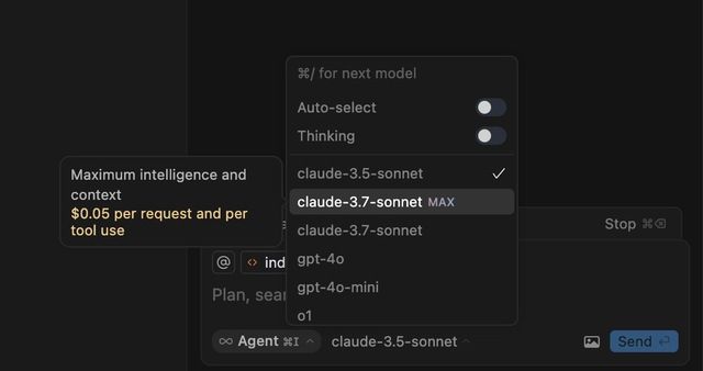 Cursor AI hỗ trợ các mô hình, trong đó claude-3.7-sonnet MAX sẽ tiêu tốn của bạn 0,05 USD mỗi yêu cầu