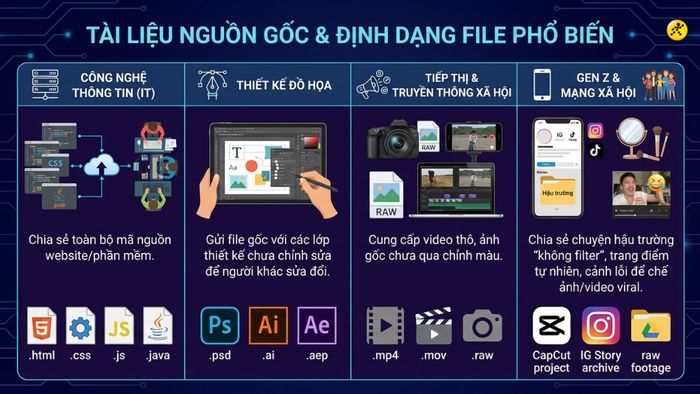 Tùy theo tính chất công việc của mỗi ngành nghề, "xả source" có thể ám chỉ việc cung cấp các loại tệp tin hoặc dữ liệu gốc với nhiều định dạng khác nhau: