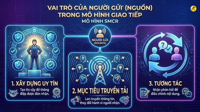 Trong mô hình truyền thông cơ bản (SMCR), Source (Nguồn phát) giữ vai trò là chủ thể khởi đầu và dẫn dắt toàn bộ quá trình truyền tải thông tin: