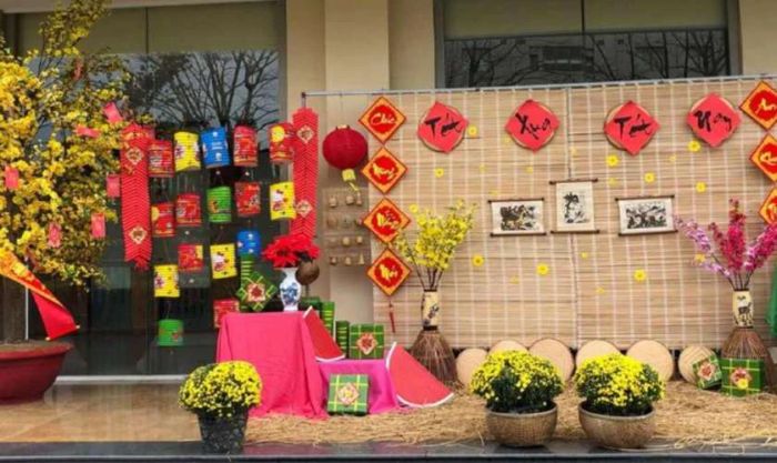 Một ý tưởng thú vị khác là dựng phông nền với câu đối đỏ, hoa mai, hoa đào, và bảng hiệu viết chữ “Gian hàng Tết” thật nổi bật. Bạn có thể bố trí thêm khu vực trò chơi nhỏ hoặc gian hàng đồ handmade để trẻ tự tay trải nghiệm và tìm hiểu về Tết.