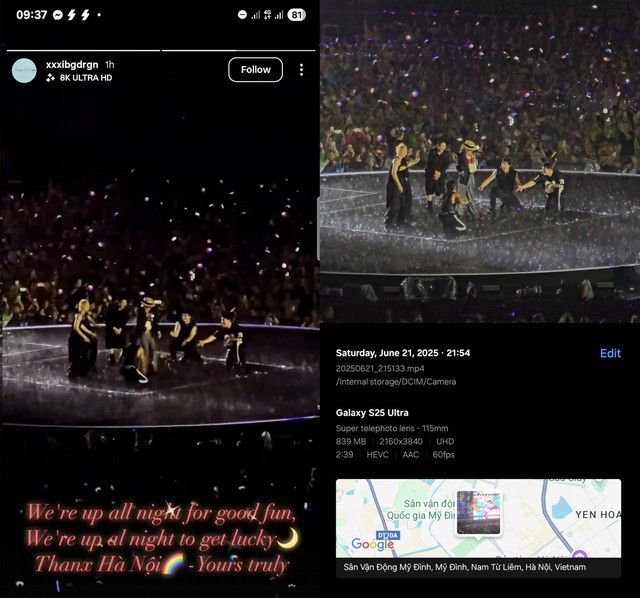 Bên trái: Story Instagram G-Dragon đăng tải sau buổi diễn - Bên phải: Clip gốc do Lưu Việt Thắng ghi lại bằng Galaxy S25 Ultra.