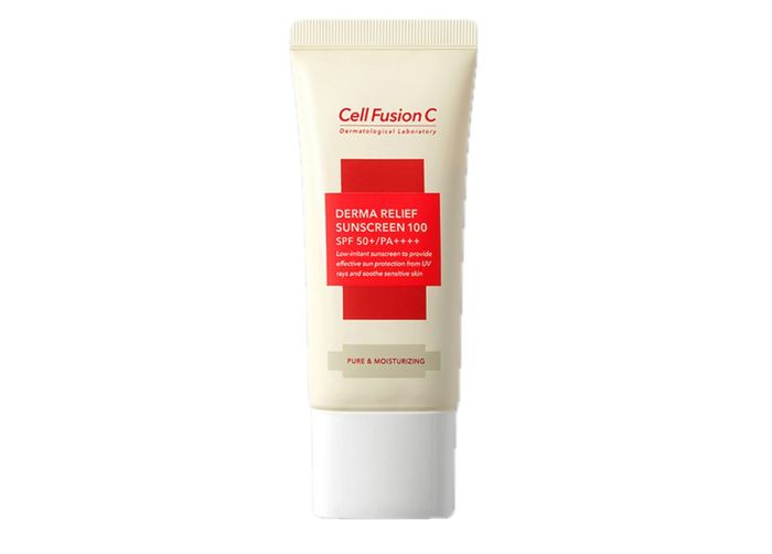 Cell Fusion C Derma Relief Sunscreen 100 SPF50+/PA++++ (màu hồng) chuyên biệt cho da nhạy cảm, da đang hồi phục sau điều trị hoặc dễ bị kích ứng.