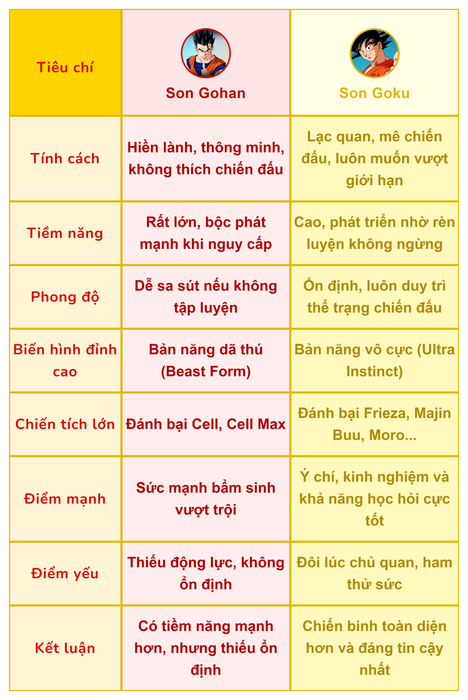 Tuy nhiên, chính sự ổn định và kiên định đã giúp Goku vượt lên Gohan ở nhiều giai đoạn. Trong khi Gohan dễ mất phong độ nếu không luyện tập, Goku luôn duy trì được sức mạnh và không ngừng đột phá.