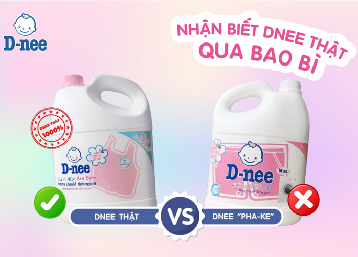 Nước giặt Dnee chính hãng có thông tin in rõ ràng trên bao bì (Nguồn: Internet)Phân biệt bằng cách quan sát đáy chai