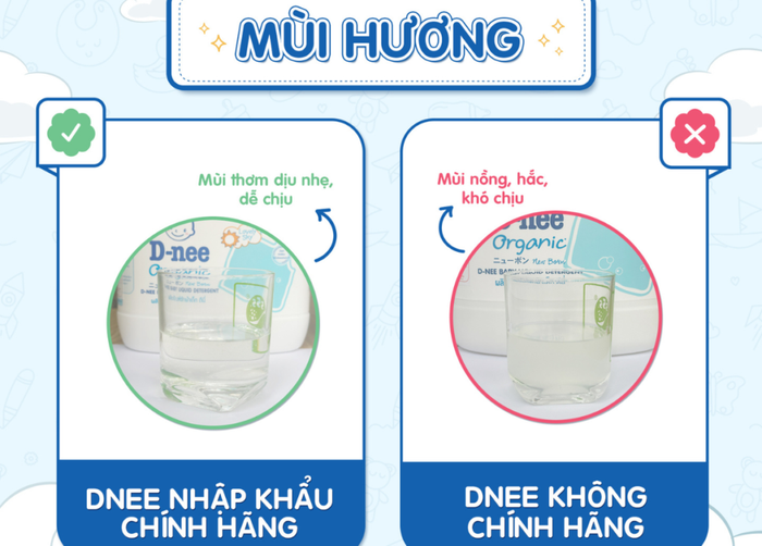 - Hàng thật: Nước giặt Dnee có kết cấu lỏng, màu trắng đục, hơi sánh. Mùi hương dịu nhẹ, tự nhiên và dễ chịu.