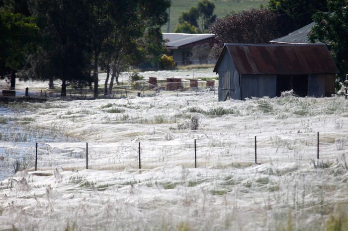 Một ví dụ ấn tượng xảy ra vào năm 2021 tại bang Victoria, khi khu vực này hứng chịu những trận mưa xối xả cùng gió giật mạnh, buộc hàng nghìn cư dân phải di tản và gây mất điện trên diện rộng. Đặc biệt, vùng East Gippsland chịu ảnh hưởng nặng nề nhất, và ngay sau đó, những tấm lưới tơ nhện khổng lồ đã xuất hiện, nhuộm trắng cả một vùng đất rộng lớn.