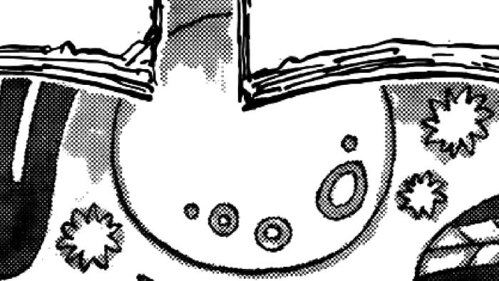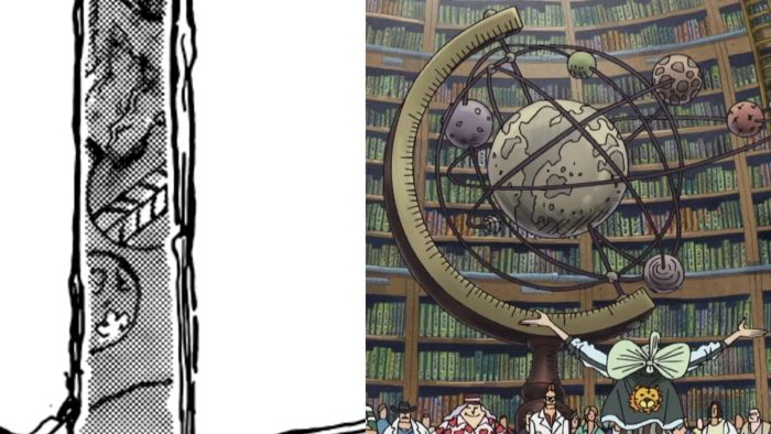 Một trong những quả trứng phục sinh đầu tiên và thú vị nhất trong bức tranh tường được ẩn giấu ngay giữa các bong bóng văn bản, chứa các khổ thơ về thế giới thứ nhất và thứ hai. Nếu nhìn kỹ hơn, người hâm mộ sẽ thấy ngoài mặt trăng, bức tranh còn miêu tả các thiên thể khác, gợi nhớ đến ký ức Ohara, tiết lộ mô hình quả cầu đầu tiên của hành tinh xanh trong One Piece, bao quanh bởi sáu mặt trăng. Chi tiết này đã trở thành chủ đề bàn luận sôi nổi của cộng đồng người hâm mộ suốt nhiều năm qua.