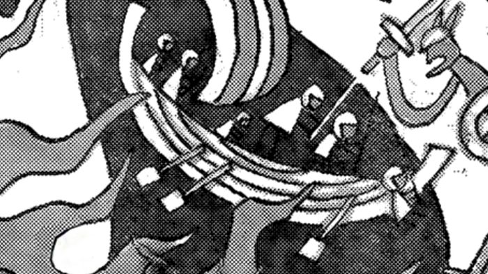 Nổi bật ở góc dưới cùng bên trái của bức tranh tường, người hâm mộ có thể nhận ra một con tàu với năm nhân vật trên boong, một trong số đó dường như đang rơi khỏi thuyền. Có thể những hình ảnh này đại diện cho Ngũ lão tinh đang tiến vào cuộc chiến chống lại Nika, với nhân vật rơi khỏi thuyền có thể tượng trưng cho Thánh Saturn, người đã bị tước quyền và được thay thế bởi Garling. Những nhân vật này cũng dường như đang đội mũ bảo hiểm, có thể ám chỉ bộ đồ vũ trụ của Thiên Long nhân.