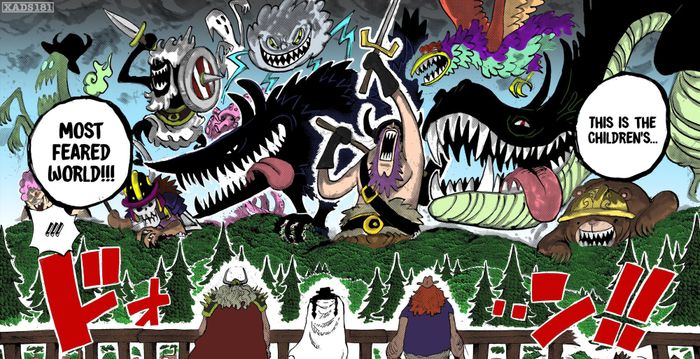 Chuyển sang khu rừng ở Dương Giới, trong một trang đôi khác, băng hải tặc Chiến Binh Cự Nhân đang đối đầu với nhiều quái vật giấc mơ trên chiếc tàu Great Eirik phiên bản Sval. Gaban nhảy qua những người khổng lồ và chém đôi quái vật Loki bằng rìu. Ông ấy nói rằng nếu bọn trẻ biết về Loki thực sự, quái vật trong mơ sẽ còn mạnh hơn rất nhiều. Sau đó, Gaban cảm nhận được 3 giọng nói và nói rằng: "Nếu ngay cả Elbaph cũng không an toàn, thì thế giới này tàn rồi..."