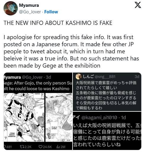 Sau khi Triển lãm JJK tại Osaka, Nhật Bản khai mạc vào ngày 19 tháng 4 năm 2025, một số tài khoản đã bắt đầu chia sẻ các bản dịch Q&A của Gege Akutami. Dĩ nhiên, một số trong số chúng đã bị chứng minh là sai, bao gồm phiên bản do @Go_Jover chia sẻ, trong đó có thông tin sai về việc Sukuna xem Kashimo là mối đe dọa lớn nhất của mình sau cái chết của Gojo.