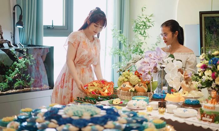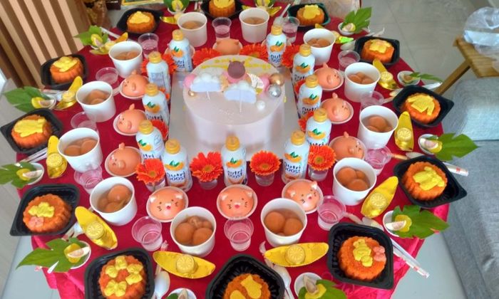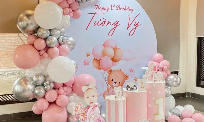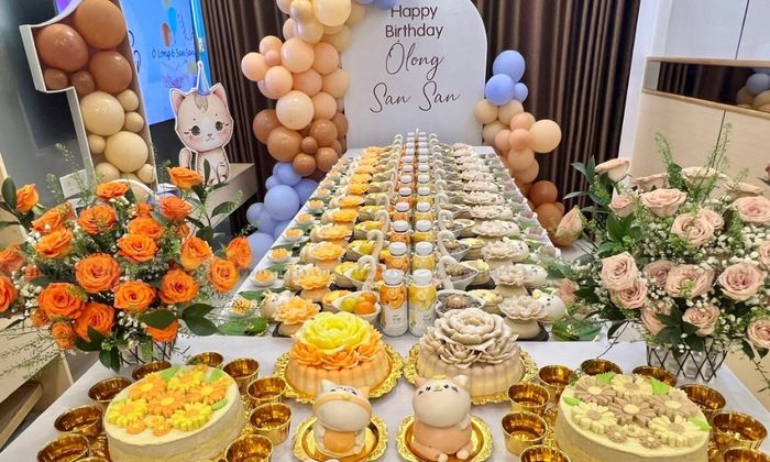 Bàn tiệc là yếu tố trung tâm. Ba mẹ có thể sử dụng bong bóng hoặc các vật dụng truyền thống để tạo nên không gian sống động và thuận tiện cho việc chụp ảnh lưu niệm.