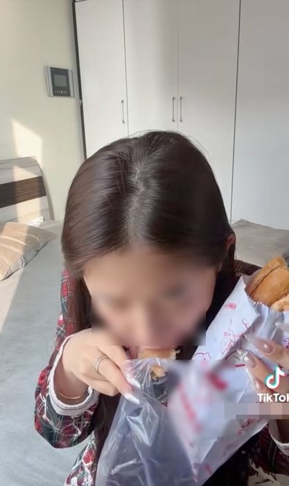 Trong video, cô nói: 'Tại sao mọi người chưa bao giờ thấy mình ăn bánh mì. Với tôi, bánh mì chỉ ăn khi đói khát, khổ cực. Mình cảm giác ăn bánh mì rất khổ. Hôm nay hết tiền nên tôi sẽ ăn bánh mì.'