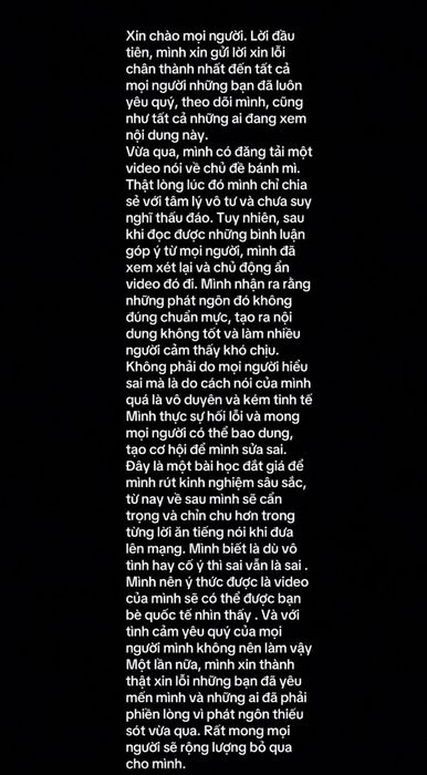 Cô thừa nhận rằng phát ngôn của mình không phù hợp, tạo ra nội dung không hay và khiến nhiều người khó chịu. "Không phải mọi người hiểu sai, mà là do mình nói quá vô duyên và thiếu tinh tế. Mình rất hối hận và mong mọi người có thể tha thứ, cho mình cơ hội sửa sai," cô bày tỏ.