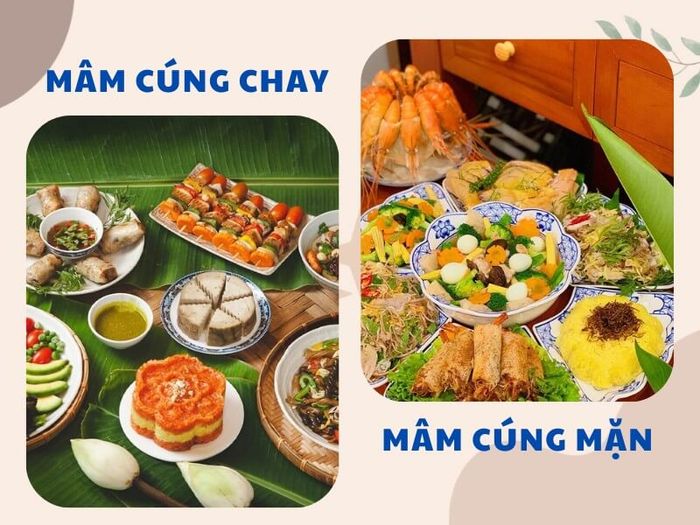 Mâm cúng chay: Phù hợp với các gia đình ăn chay. Mâm cúng chay có thể bao gồm các món như nem chay, xôi, gỏi rau củ, heo non chay sốt chua ngọt, miến xào, canh nấm,...