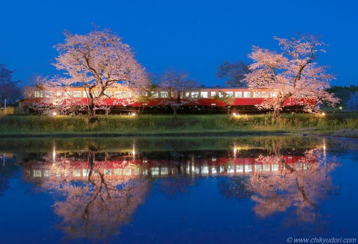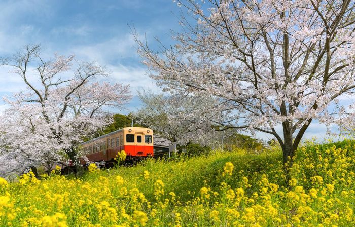 Kominato Railway là tuyến tàu địa phương chạy qua vùng nông thôn yên bình của tỉnh Chiba. Tuyến tàu này nối thành phố Ichihara với thị trấn Otaki. Hành trình trên tàu chậm rãi đưa bạn qua những ngôi nhà gỗ mộc mạc, những cánh đồng hoa cải vàng (nanohana) trải dài bất tận và những tán hoa anh đào nở rộ, lắc lư trong gió xuân.
